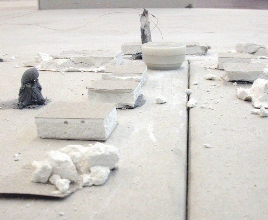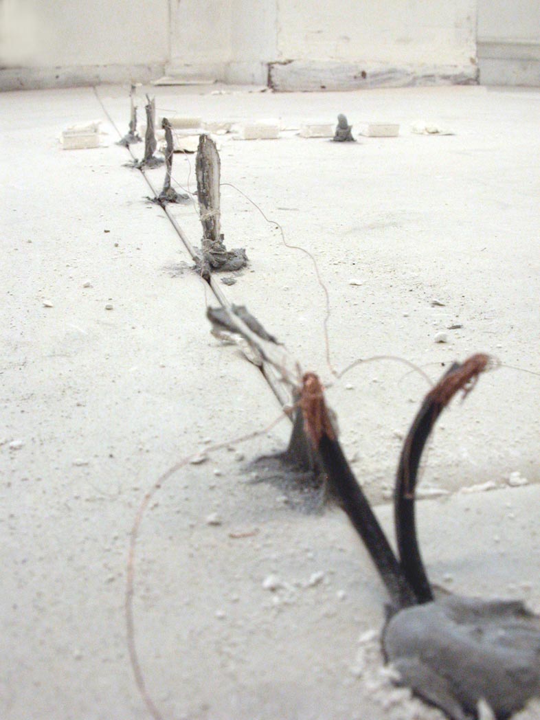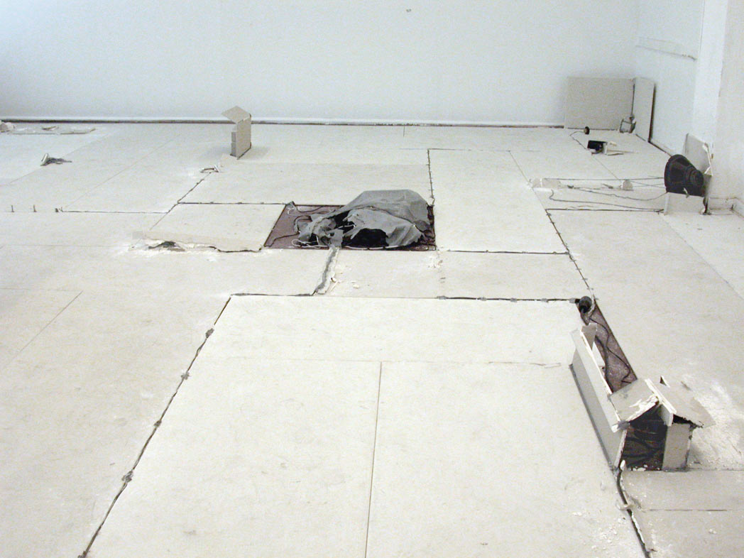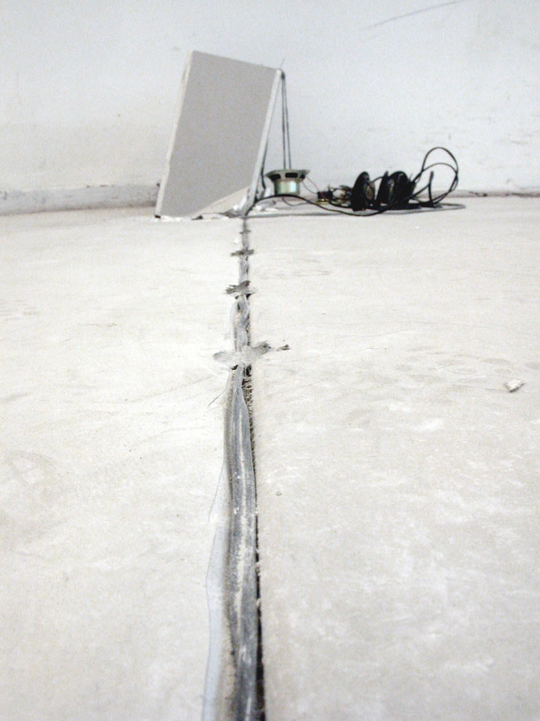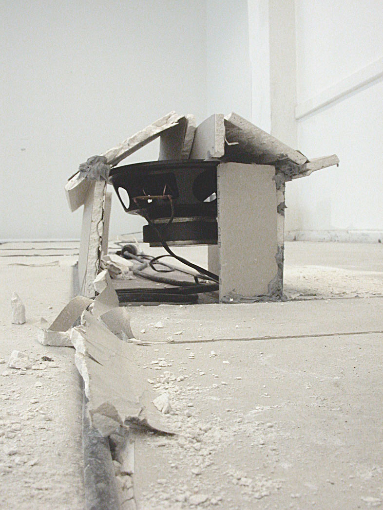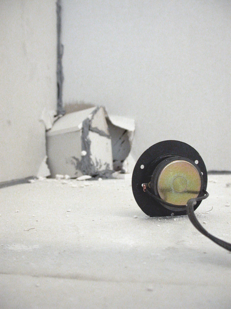 Freiwillige Feuerwehr Installation in collaboration with Paul Zoller – wallboards (gypsum), silicone, silicone strings, speaker cable, 17 loudspeakers, 5 stereo sound tracks