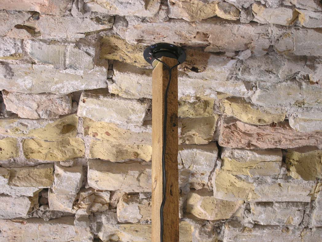 in die länge gezogener Geistesblitz Installation – Holz, Silikonschnüre, Lautsprecherkabel, 10 Lautsprecher, 5 Stereo Tonspuren