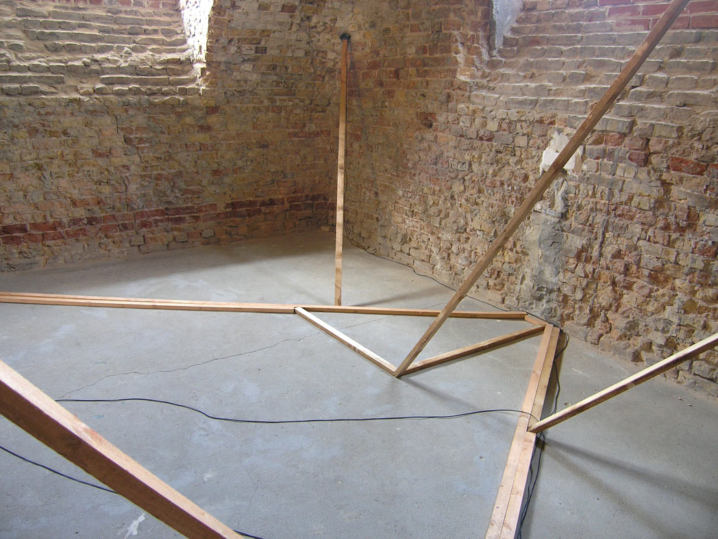 in die länge gezogener Geistesblitz Installation – wood, silicone strings, speaker cable, 10 loudspeakers, 5 stereo sound tracks