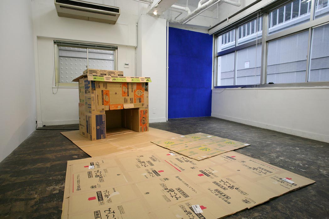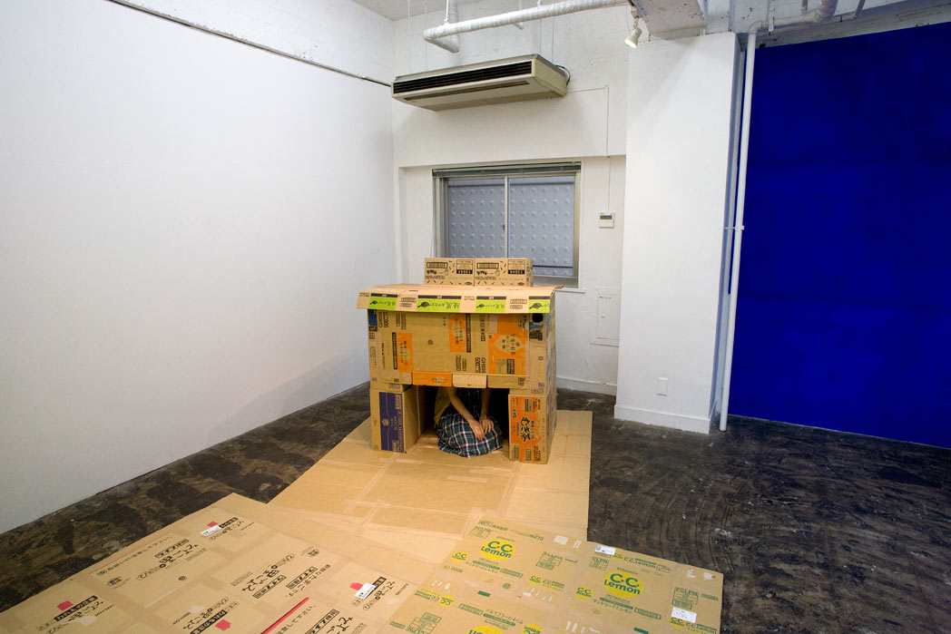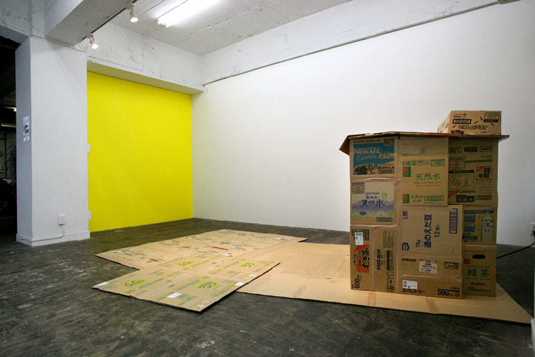 KAPUZE Osaka Installation in collaboration with Anja Gerecke – acrylic paint, cardboard, tape, 3 loudspeakers, 2 stereo sound tracks