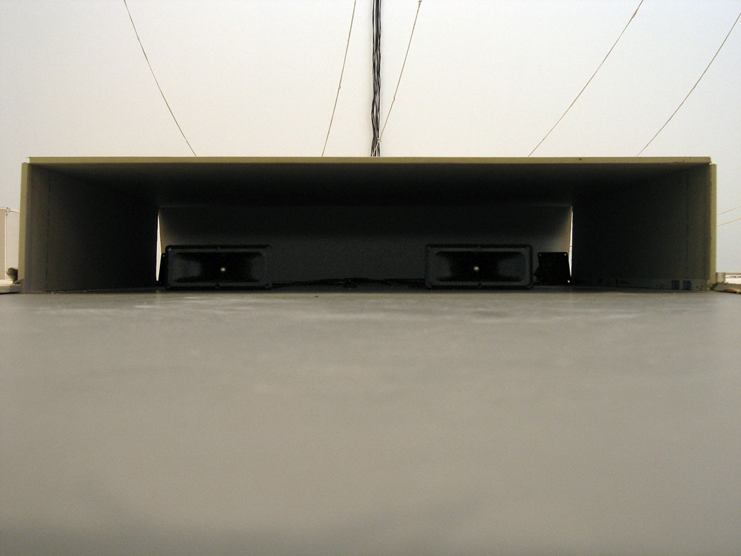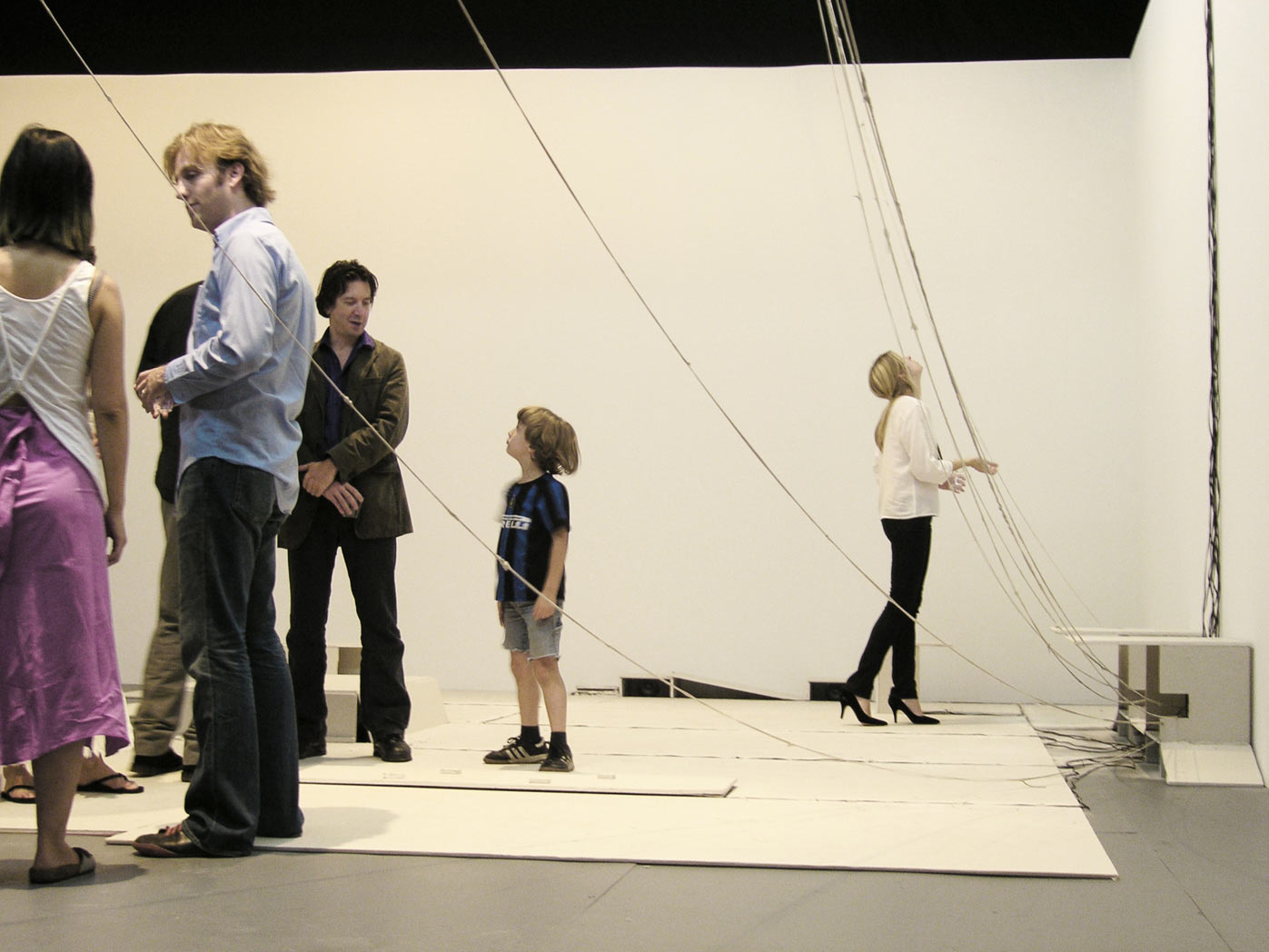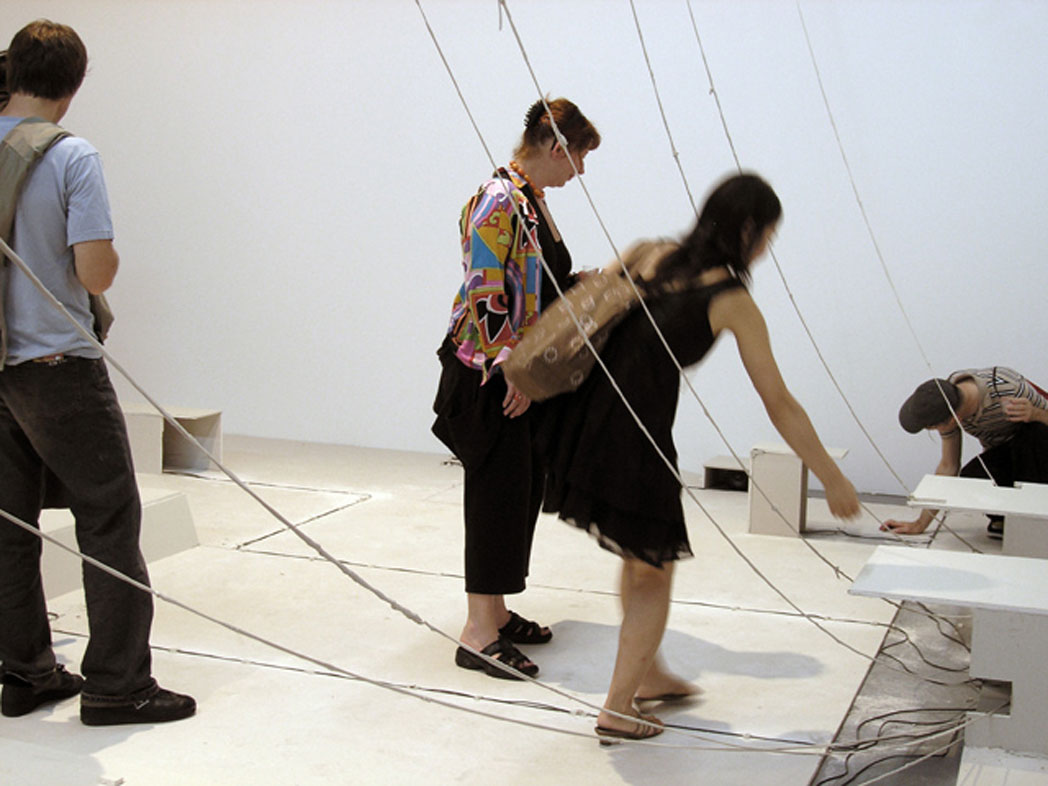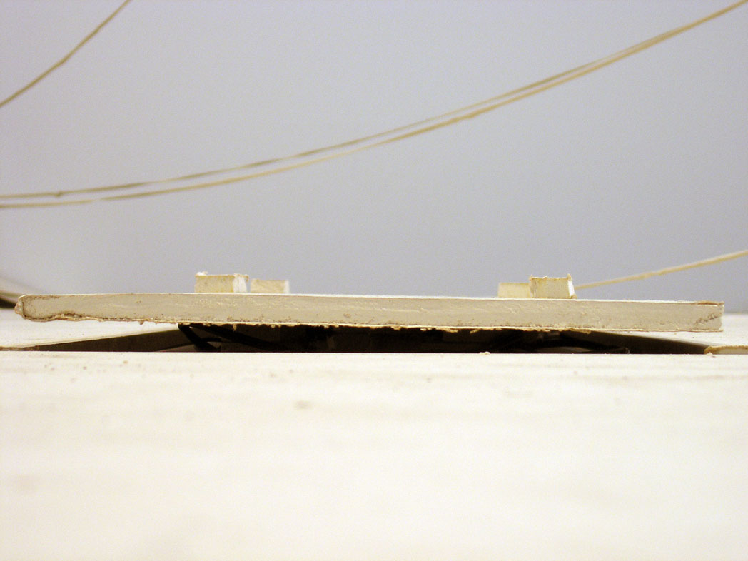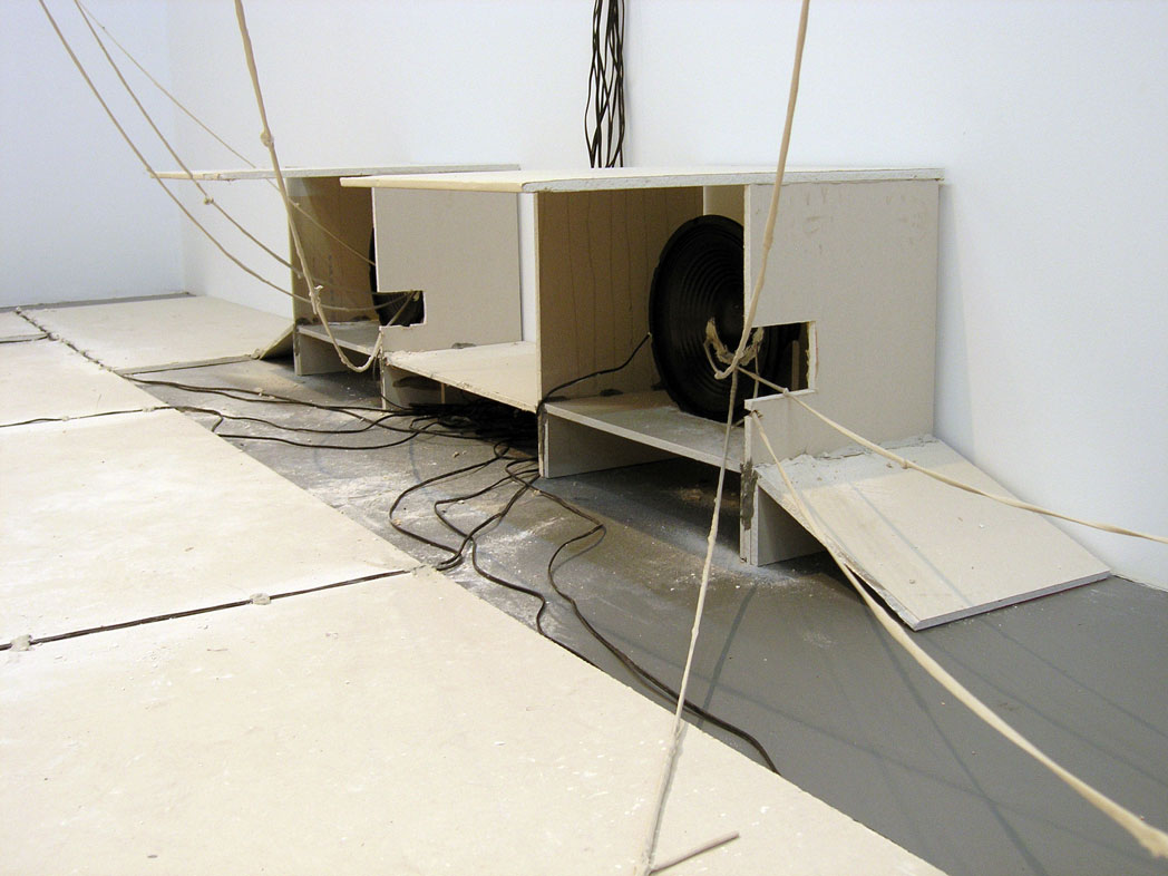 Schattengemeinde Installation – wallboards (gypsum), silicone, silicone strings, speaker cable, neon lamps, 10 loudspeakers , 5 stereo sound tracks
