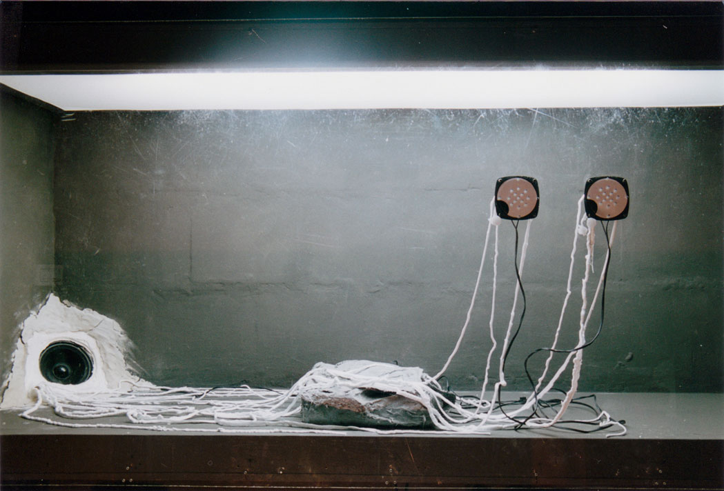 Silitop Installation – showcase, acrylic glass, clay, silicone, silicone strings, cassette deck covering, 3 loudspeakers, 1 stereo sound track