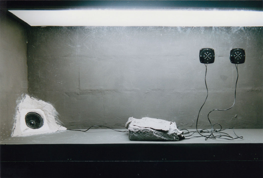 Silitop Installation – Vitrine, Acrylscheibe, Ton, Silikon, Silikonschnüre, Kassettenrecorder Hülle, 3 Lautsprecher, 1 Stereo Tonspur