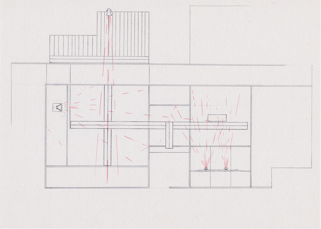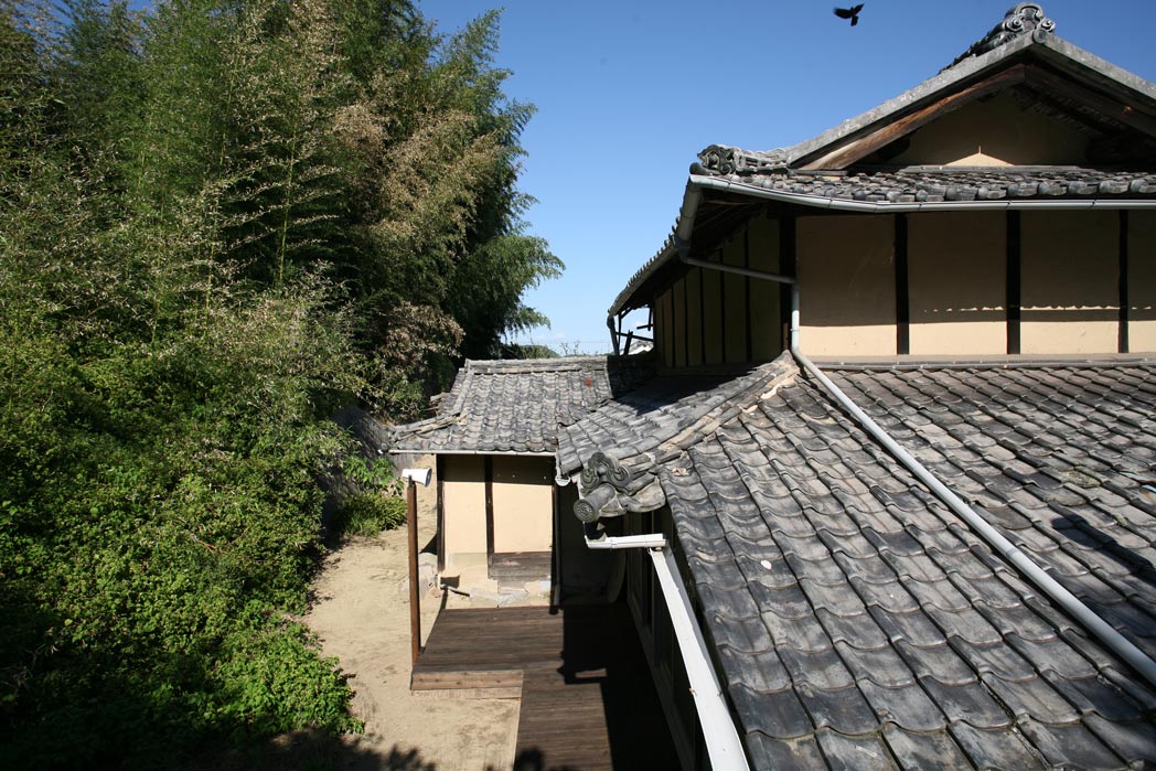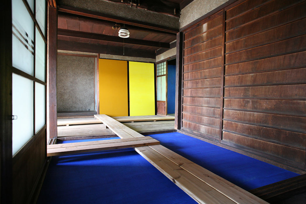 Tage-des-Geta Installation in collaboration with Anja Gerecke – traditional japanese house, board walk (wood), outdoor platform (wood), painted plywood, acrylic paint, bamboo, 4 loudspeakers, 2 stereo sound tracks