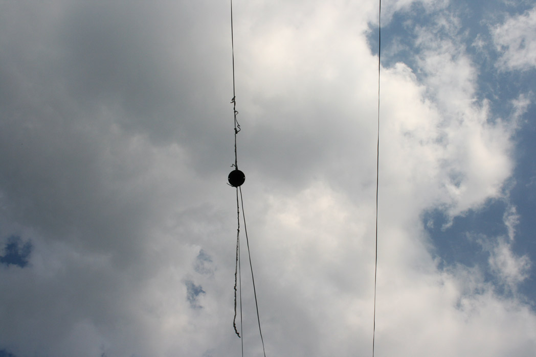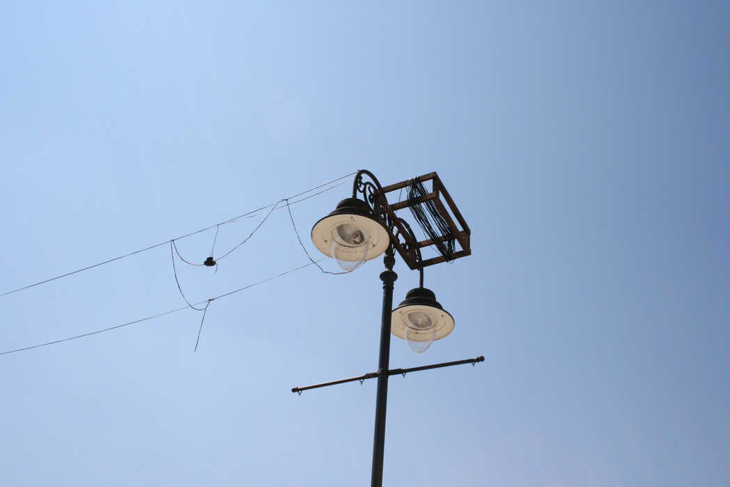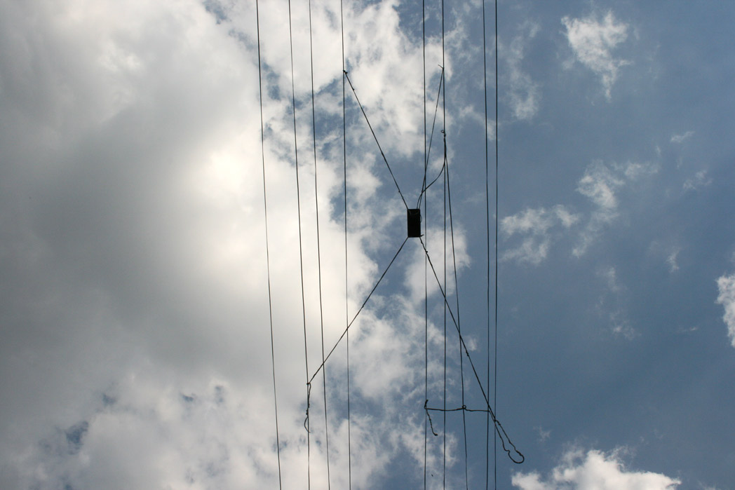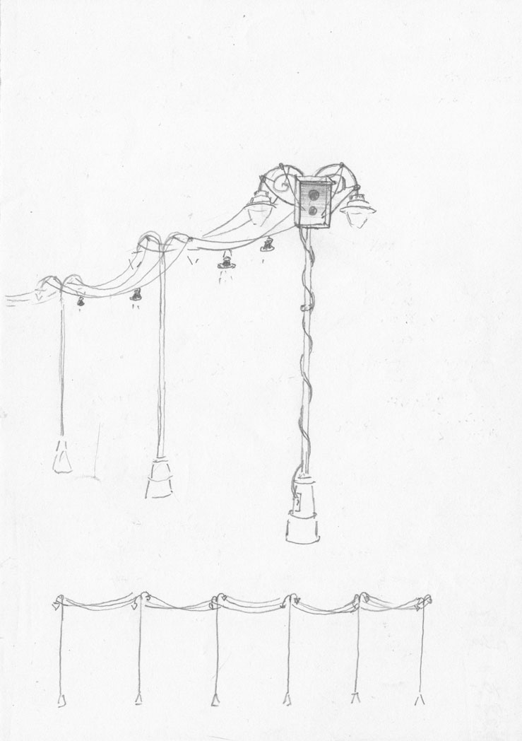 Verlängerungen Installation – street lights, speaker cable, silicon strings, wooden box, 8 loudspeakers, 4 stereo sound tracks